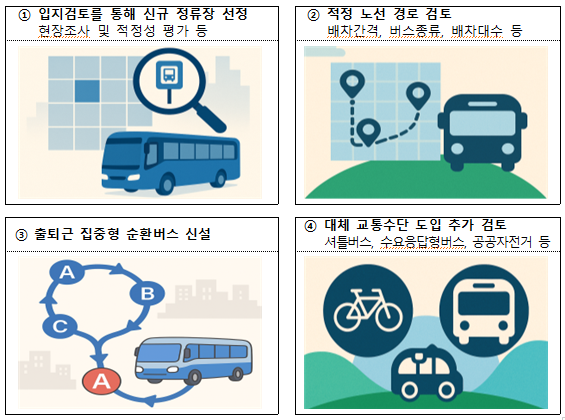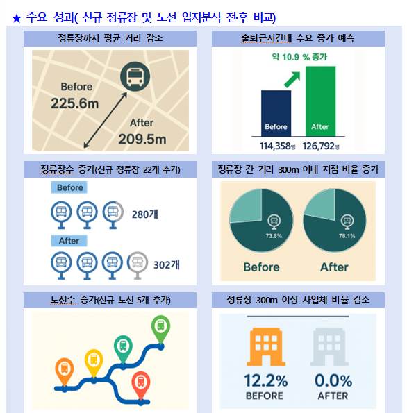 통계 빅데이터와 머신러닝 기법을 활용해 산업단지 내 정류장 입지와 신규 노선을 분석한 결과, 정류장 22개소와 신규 노선 5개를 추가 배치하는 방안을 도출했다. 이를 통해 정류장까지 평균 거리가 225m에서 209.5m로 줄고, 출퇴근 대중교통 이용자가 약 10.9% 증가할 것으로 예상된다.
