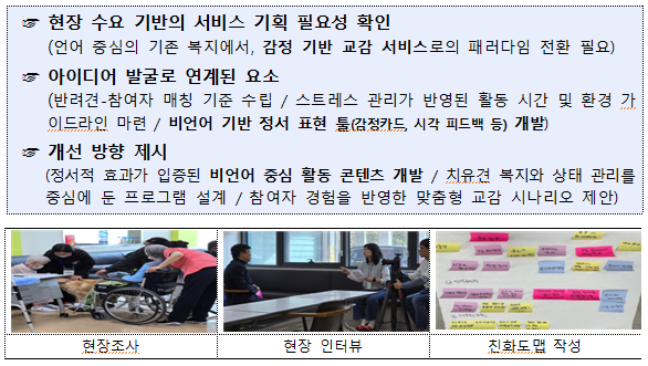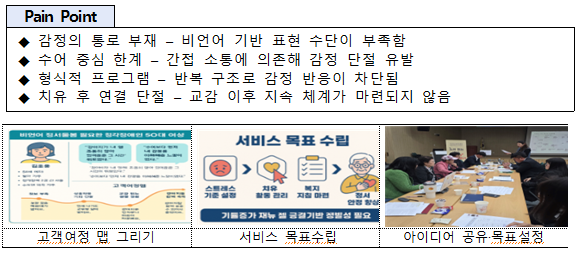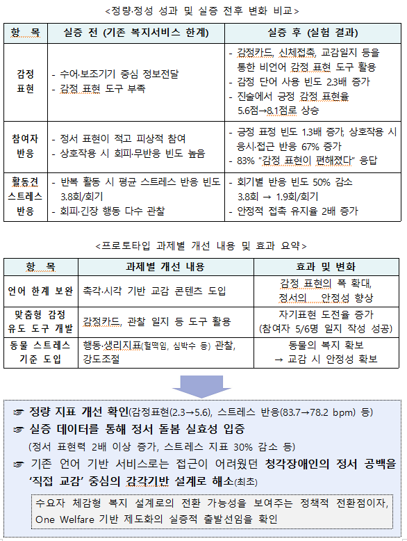 - 청각장애인을 대상으로 한 비언어 기반 정서지원 서비스 실증을 통해, 기존 언어 중심 복지의 한계 보완 가능성 확인
