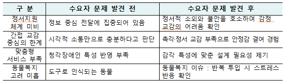 프로젝트에서는 청각장애인, 수어통역사, 훈련사, 복지사 등과 함께 국민디자인단을 구성해 수요자 조사를 실시했다. 그 결과 기존 복지서비스에서 87%가 정서적 소외를 경험했다고 답했으며, 참여자들은 시각·촉각 중심의 교감 활동에서 즉각적 안정감을 느꼈다고 보고했다. 또한 반복된 치유활동에서 활동견의 스트레스 반응이 높게 나타나 사람과 동물 모두를 고려한 새로운 기준이 필요함이 확인되었다.