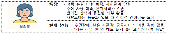 - (치유) 동물교감치유를 통해 우울감·고립감 해소 등 정신건강 개선
