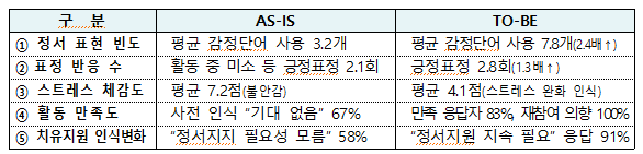 ○ (정서안정) 스트레스(2.4배↓), 긍정 표현(1.3배↑) → 치유효과 확인