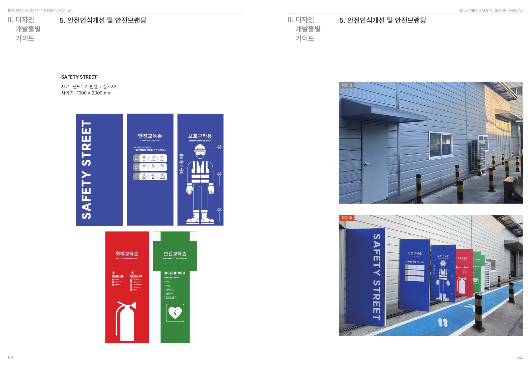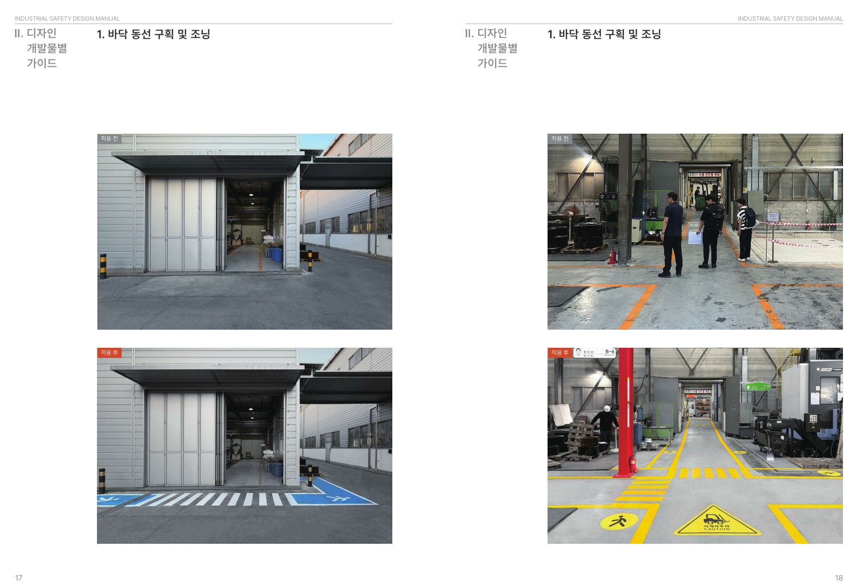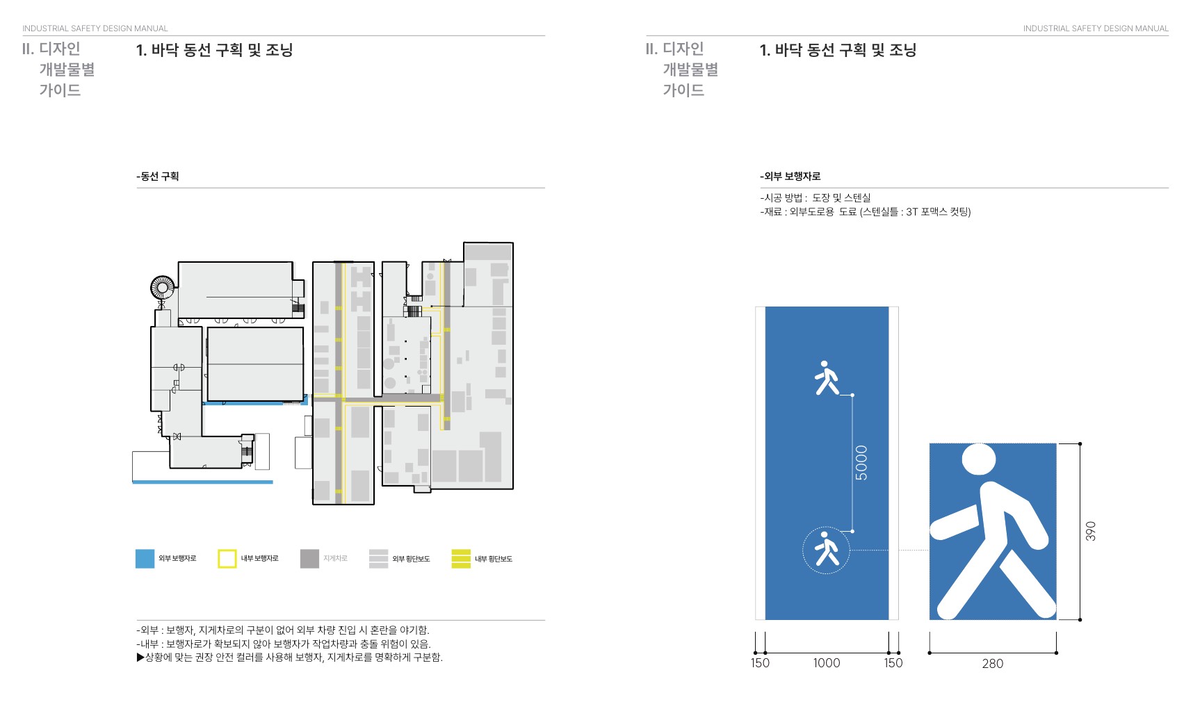 가이드북에는 안전색채, 서체시스템, 안전 사인물 관리체계, 안전브랜딩 등 기본 원칙이 포함되어 있으며, 이를 바탕으로 현장 내 안전정보를 일관된 체계로 운영할 수 있도록 구성되어 있습니다. 또한 바닥 동선 구획 및 조닝, 안전 사이니지 체계, 설비영역 간판 제작, 비상상황 예방 및 대응 체계, 안전인식개선 및 안전브랜딩, 유해물질 관리 체계, 근로휴게공간 개선 등 현장 적용에 필요한 주요 항목을 확인할 수 있습니다.