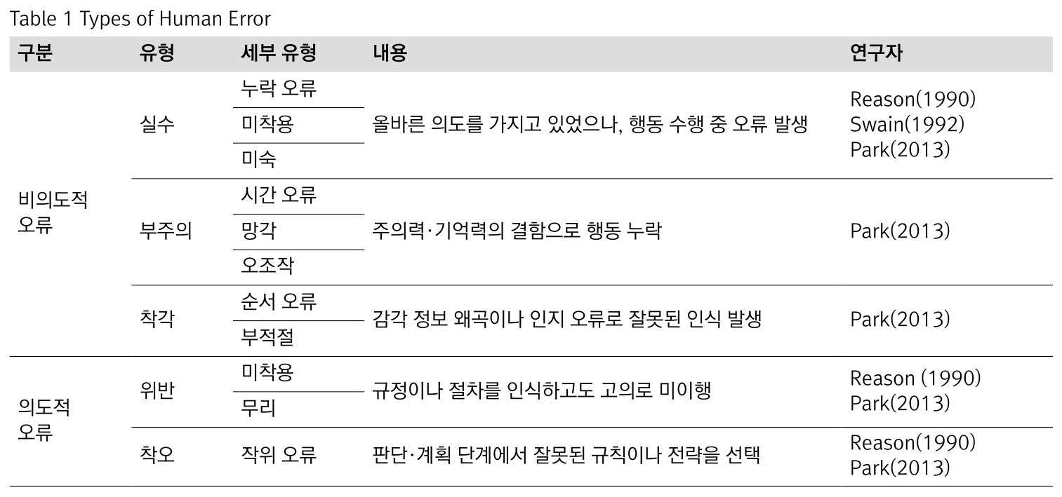 즉, 안전 디자인은 사전 예방적 설계와 통합적 관리를 통해 작업 환경의 위험 요인을 미리 차단하고 안정적 운영을 보장한다. 안전보건공단의 연구에 따르면 국내 중대 재해의 약 34%는 인적 오류(Human Error)에서 비롯된다(Park, 2013). 인적 오류는 작업자가 의도, 규정, 외부 기대와 다른 행동을 수행함으로써 시스템의 허용 범위를 벗어나거나(Senders & Moray, 1991), 요구된 정확도, 순서, 시점에 맞춰 행동을 수행하지 못해 바람직하지 않은 결과를 초래하는 것을 의미한다(Hollnagel, 1993). Swain & Guttmann(1983)은 인적 오류를 누락, 작위, 시간, 순서의 오류로 분류하였고, Reason(1990)은 인적 오류를 의도적 오류(착오, 위반)와 비의도적 오류(실수, 망각)로 분류하였다. Park(2013)은 2012년 중대 재해 조사보고서를 기준으로 351건의 인적 오류와 관련된 단어를 텍스트 분석한 결과, 실수, 착오, 착각, 위반, 오조작, 미숙, 무리, 부주의, 미착용 등의 대표적인 인적 오류 관련 어휘를 도출하였다. 앞선 연구자의 인적 오류 유형을 분류한 결과는 Table 1과 같다. 비의도적 오류에는 실수(누락 오류, 미착용, 미숙), 부주의(시간 오류, 망각, 오조작), 착각(순서 오류, 부적절)이 해당하며, 의도적 오류에는 위반(미착용, 무리)과 착오(작위 오류)가 해당한다.