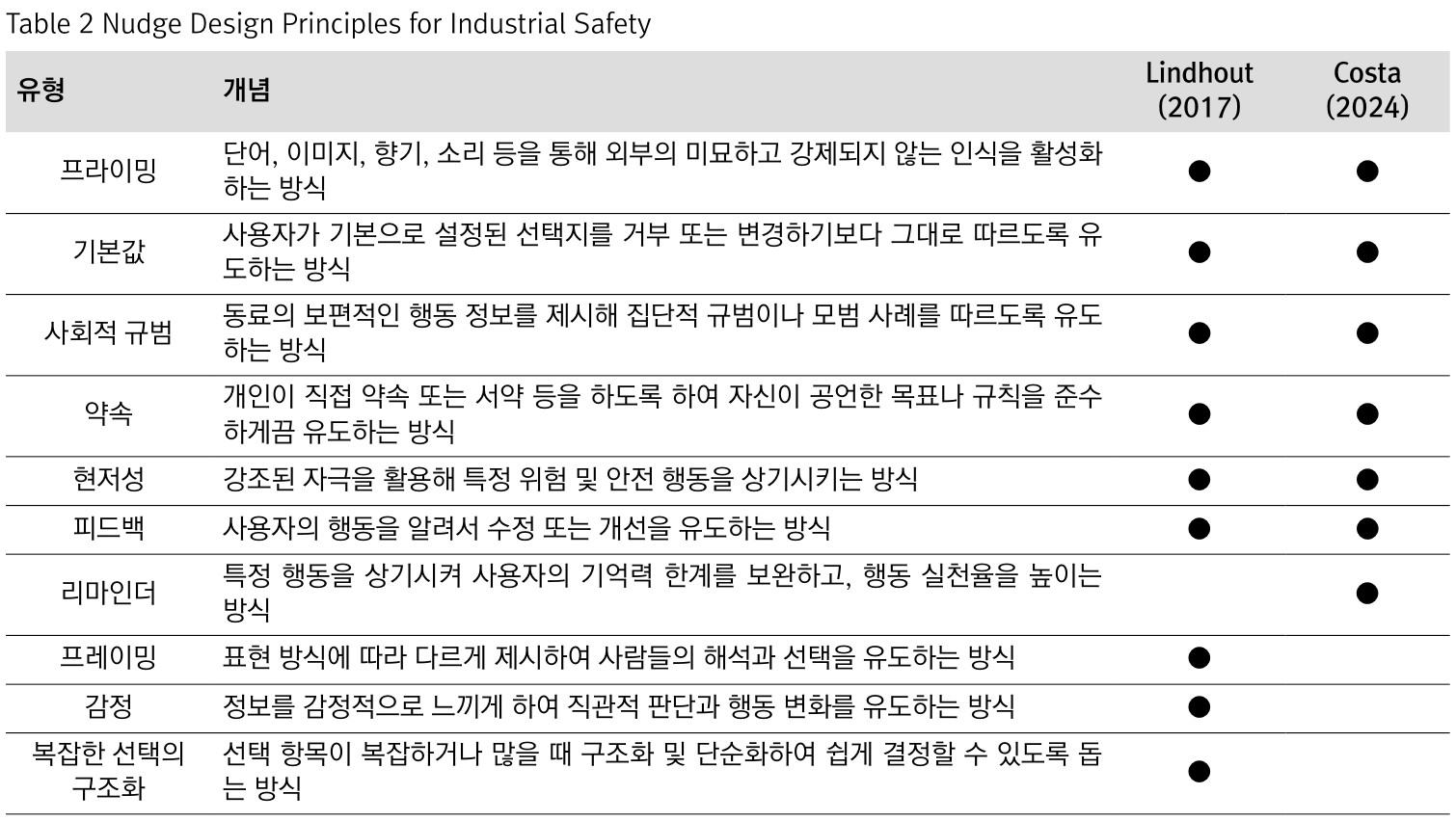 넛지(Nudge)는 '팔꿈치로 슬쩍 찌르다' 또는 '주의를 환기시키다'라는 의미로, 선택의 자유를 제한하지 않으면서도 부드럽게 특정 행동을 유도하는 설계 기법을 의미한다(Thaler & Sunstein, 2008). Lindhout & Reniers(2017)는 보건, 에너지, 교통 등 다양한 분야의 문헌에서 넛지 사례를 수집하여 프레이밍(Framing), 기본값(Default), 사회적 규범(Social Norms), 피드백(Feedback), 현저성(Salience), 프라이밍(Priming), 감정(Affect), 약속(Commitment), 복잡한 선택 구조화(Structure Complex Choices)의 9개 핵심 유형으로 넛지 원리를 구분하였다. Costa 외 연구자(2024)는 산업 현장에서 시각적 넛지 개입이 자동적·직관적 사고 체계(System 1)에 미치는 영향을 검증한 후, 넛지 사례를 프라이밍, 기본값, 사회적 규범, 약속, 현저성, 피드백, 리마인더(Reminders)의 7개 핵심 유형으로 구분하였다. 두 연구에서 도출된 넛지 디자인 원리를 비교 정리하면 Table 2와 같다. 이 중 프라이밍, 기본값, 사회적 규범, 약속, 현저성, 피드백은 공통으로 제시된 핵심 원리로, 본 연구에서는 이를 넛지 디자인 원리로 채택하였다.