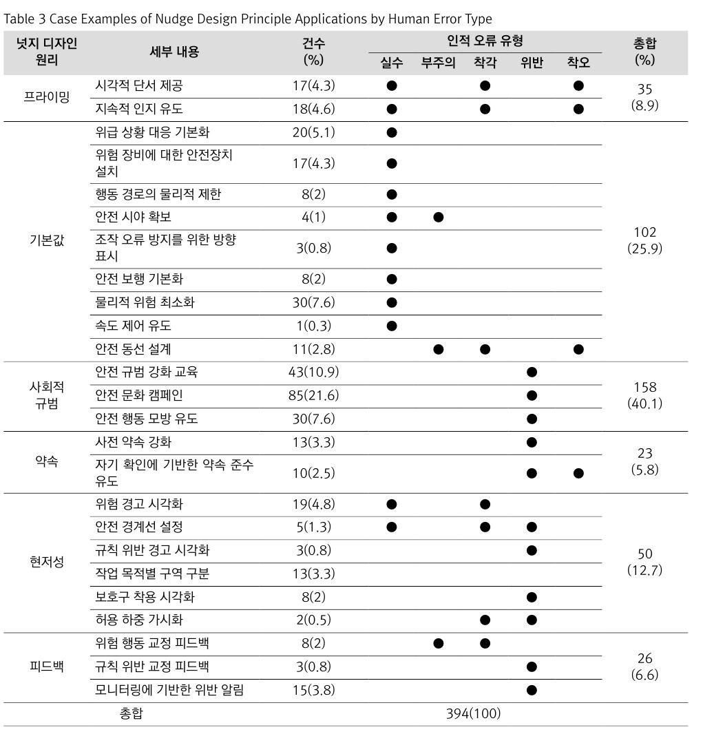 실제 산업 현장에서 넛지 디자인이 어떻게 구현되고 있는지를 살펴보기 위해 2022~2024년 나라장터와 안전보건공단 홈페이지에서 '산업 안전', '안전 개선 사례' 등을 키워드로 15건의 자료를 수집한 후, 총 1,019건의 사례를 분석하였다. 이 중 넛지 디자인 원리가 적용된 394(38.7%)건 사례에 대해 인적 오류 유형과 넛지 디자인 원리의 분류체계를 기반으로 Table 3과 같이 후행적 재분류(Post-categorization)를 진행하였다.