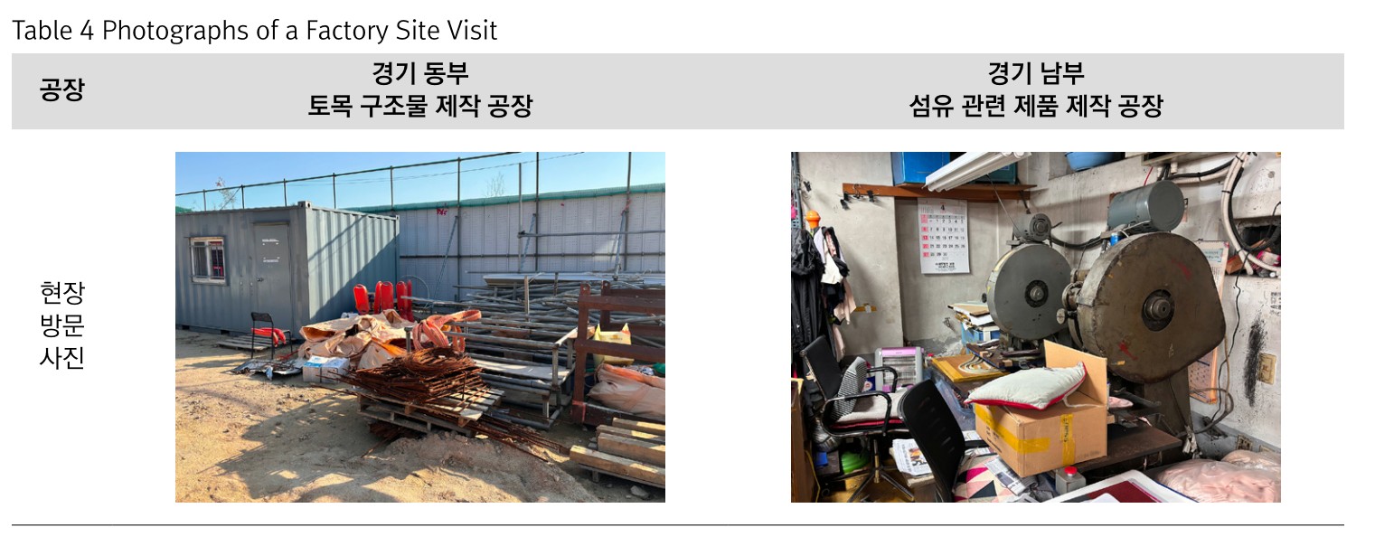 산업 현장의 안전 디자인 현황을 파악하기 위해 2025년 4월 30일 경기 동부 토목 구조물 제작 공장과 2025년 5월 6일 경기 남부 섬유 관련 제품 제작 공장 두 곳을 방문하여, 약 2시간 동안 에스노그래피를 진행하였다(Table 4). 산업 안전 넛지 디자인 툴킷의 보편적 적용 가능성을 탐색하기 위해 위험 유형과 작업 맥락이 상이한 두 제조업 공장을 사례 현장으로 선정하였다.