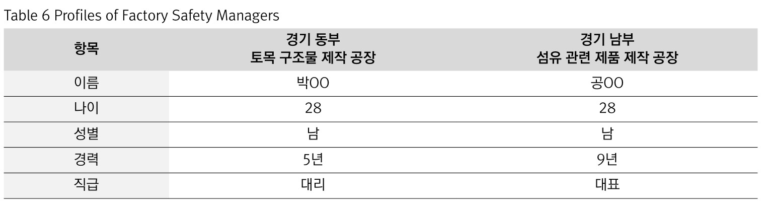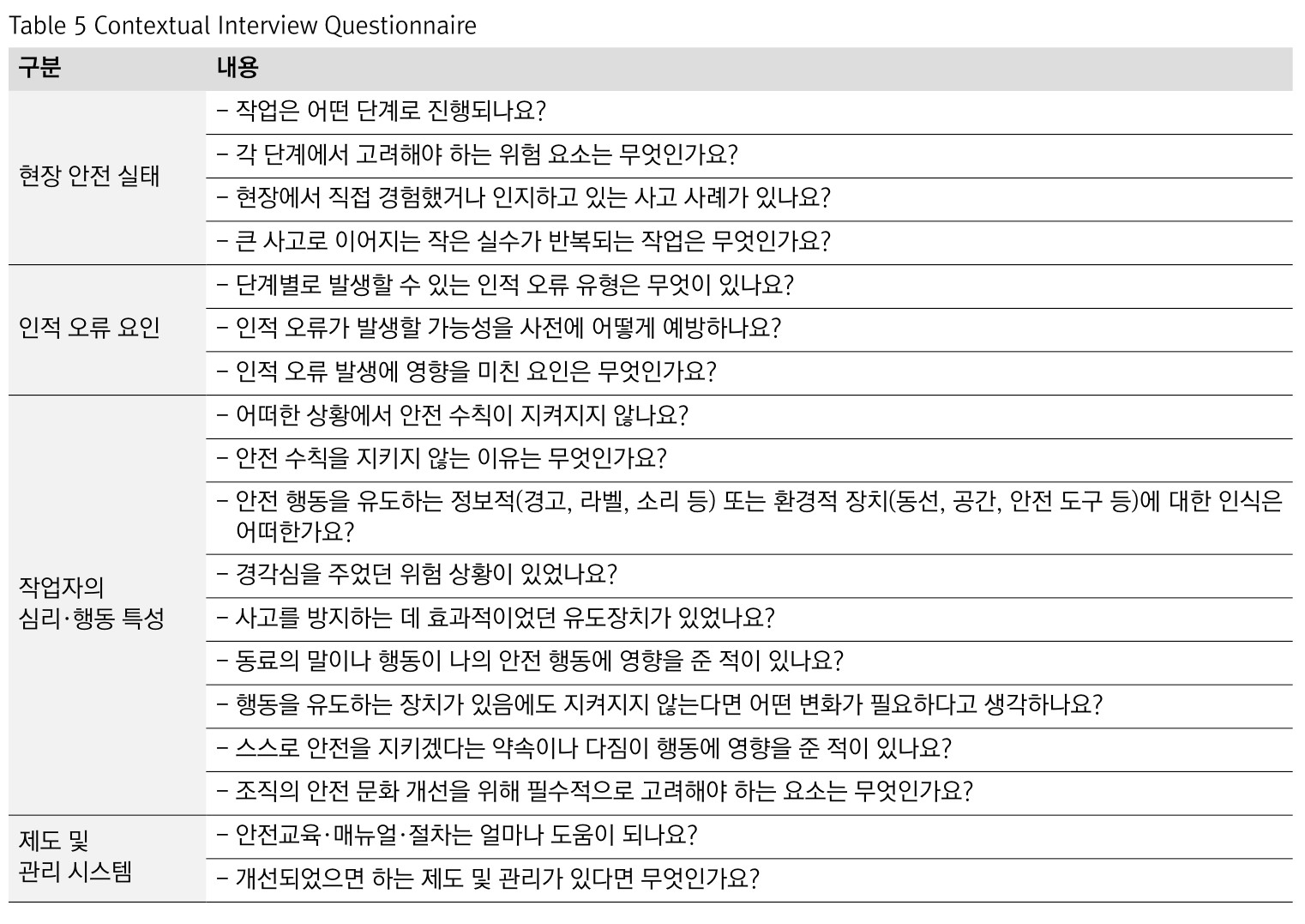 작업자의 실제 업무 흐름에 따라 쉐도우 트래킹 기법을 활용하여 작업의 순서, 행동 패턴, 위험 요인, 환경적 제약 등의 잠재적 위험 요인을 파악하였다. 또한 공장 안전관리자를 대상으로 현장 안전 실태, 인적 오류 요인, 작업자의 심리·행동 특성, 제도 및 관리 시스템을 파악하기 위한 맥락적 인터뷰를 진행하였다(Table 5, 6 참조).