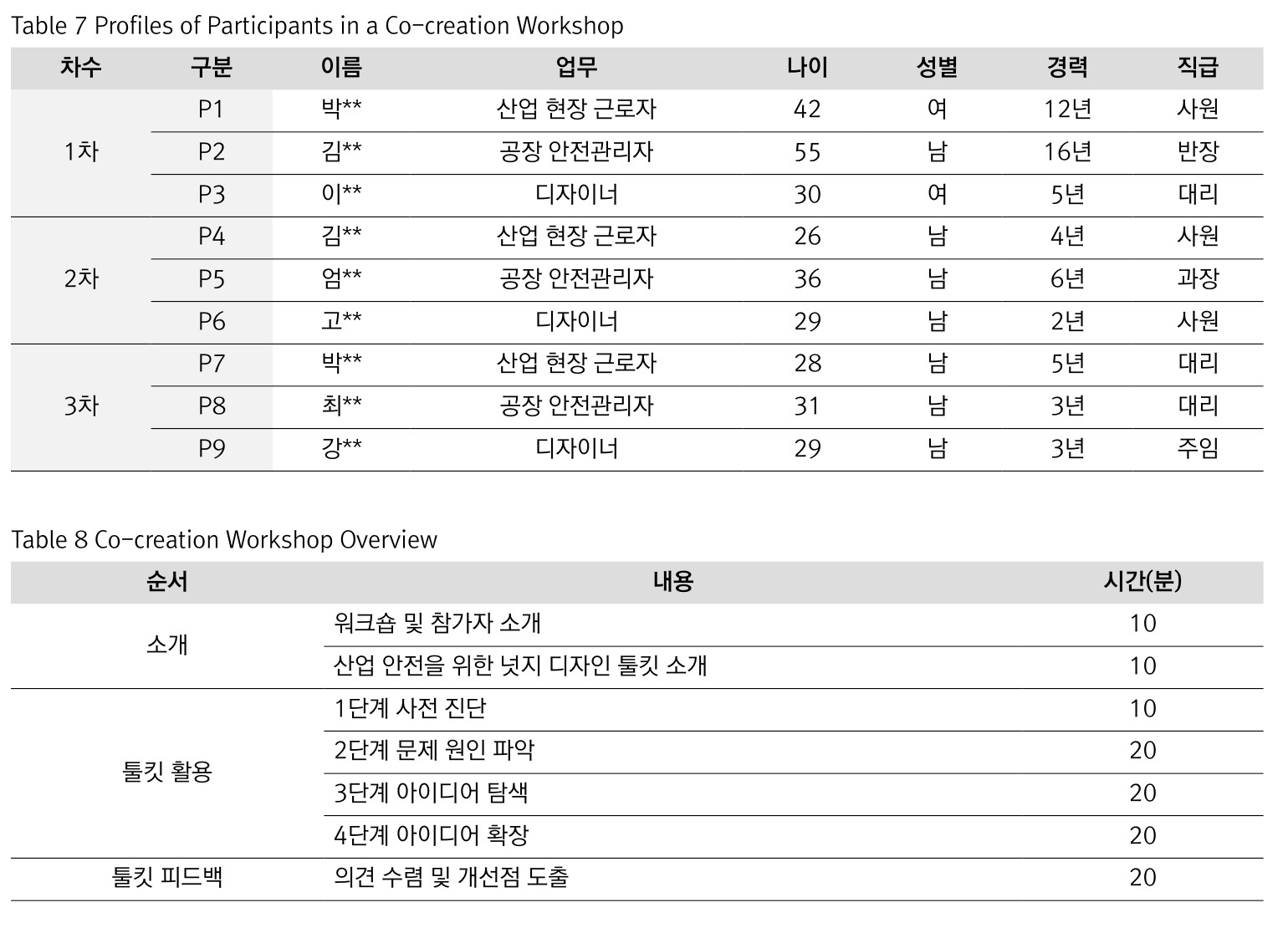 산업 안전을 위한 넛지 디자인 툴킷 프로토타입의 현장 적용 가능성을 탐색하기 위해 실무자를 대상으로 코크리에이션 워크숍을 2025년 5월 17~25일에 걸쳐 3회 진행하였다. 각 워크숍은 Table 7과 같이 산업 현장 근로자, 공장 안전관리자, 디자이너의 3인으로 구성되었다. 워크숍 참가자는 넛지 디자인 툴킷을 1단계에서 4단계까지 실제 사용하면서 툴킷의 현장 적용 가능성에 대해 논의하고 개선점을 도출하였다.