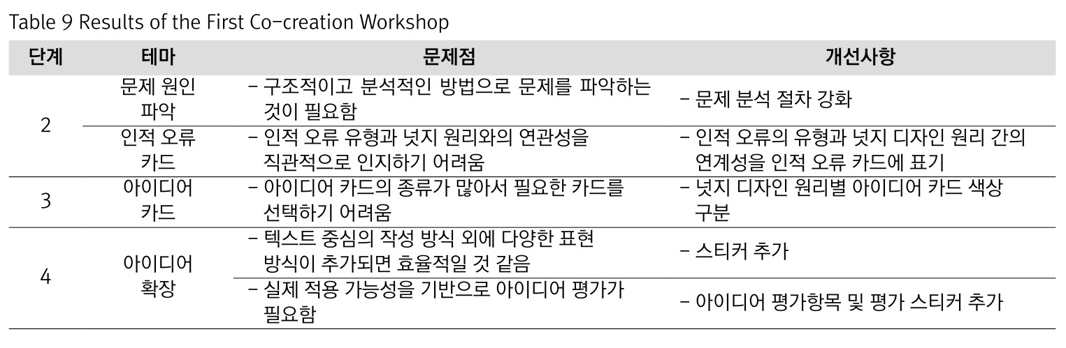 1차 코크리에이션 워크숍 결과, 참여자는 툴킷의 단계별 구성과 아이디어 카드 활용에 대해 긍정적으로 평가하였다. 문제를 찾고 아이디어를 도출하는 전체 과정이 체계적으로 설계되어 논리적 사고를 유도하고, 실제 사례 기반의 아이디어 카드가 현장에 적용 가능한 실질적인 아이디어를 도출하는 데 도움이 된다고 평가하였다. 그러나 문제를 분석하는 과정을 강화하고, 아이디어 카드에 인적 오류와 넛지 디자인 원리에 대한 설명을 추가할 것을 제안하였다. 또한 텍스트 중심의 작성이 아니라 다양한 시각적 표현 방법을 활용하고, 아이디어 카드의 색상을 구분하여 직관적으로 인지할 수 있기를 기대하였다. 그 외 적용 가능성 등 아이디어에 대한 평가 기준을 마련할 것을 제안하였다. 1차 코크리에이션 워크숍 내용에 대한 질적 내용분석 및 주제 분석 결과는 Table 9와 같다.