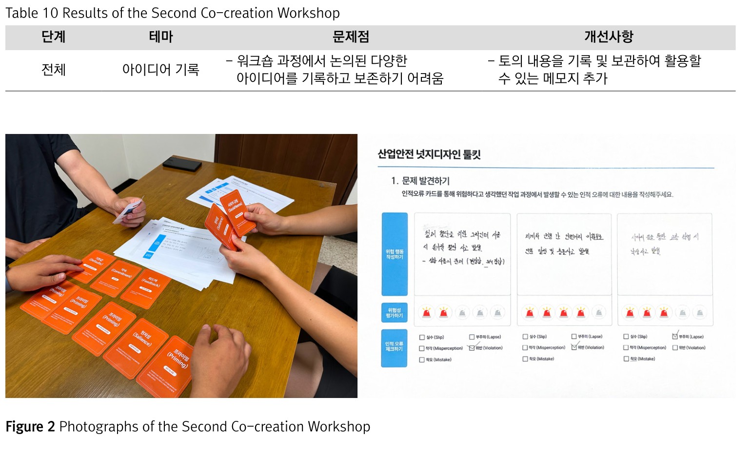 2차 코크리에이션 워크숍 결과, 참여자는 '문제 분석' 단계에서 인적 오류의 원인을 탐색하는 과정이 안전사고의 맥락을 파악하는 데 효과적이라고 응답하였다. 특히 문제의 원인을 환경적 요인과 정보적 요인으로 구분하는 구성이 문제의 유형을 체계적으로 파악하는 데 도움이 된다고 긍정적으로 평가하였다. 또한 아이디어 카드의 색상 구분과 스티커 등의 시각 자료 활용이 참여자의 흥미를 높이고, 아이디어 도출을 촉진하는데 효과적이라고 응답하였다. 반면, 일부 시트에서는 기록 공간이 부족하다는 점이 한계로 지적되었다. 2차 코크리에이션 워크숍 내용에 대한 질적 내용분석 및 주제 분석 결과는 Table 10과 같다.