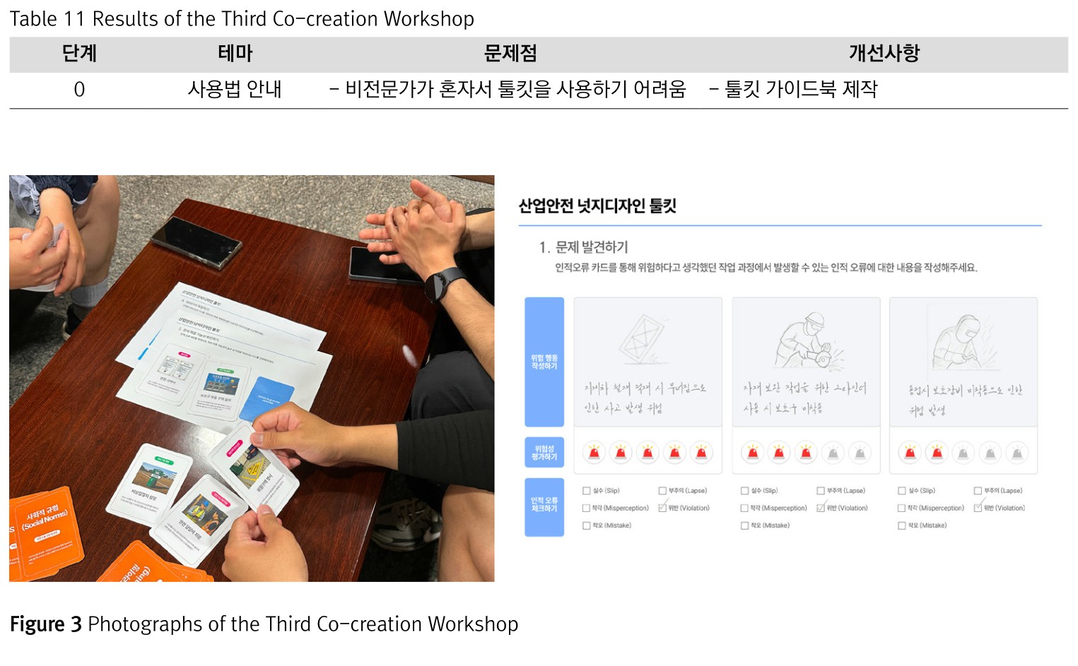 3차 워크숍 결과, 참여자는 툴킷이 인적 오류를 파악하고 넛지 디자인 원리를 적용한 아이디어를 도출하여 현장에서 안전 행동을 유도하는데 효과적이라고 응답하였다. 특히 안전 문제 파악부터 해결책 도출까지의 전 과정을 지원하는 툴킷이 매우 효율적이라고 긍정적으로 평가하였다. 다양한 시각적 자료는 추상적인 아이디어를 구체화하고 실행 가능한 방안으로 발전시키는 데 도움이 된다고 응답하였다. 그 외 비전문가가 전문가의 도움 없이 툴킷을 활용할 수 있도록 직관적 이해와 활용을 지원하는 가이드북의 필요성을 제안하였다. 3차 코크리에이션 워크숍 내용에 대한 질적 내용분석 및 주제 분석 결과는 Table 11과 같다.