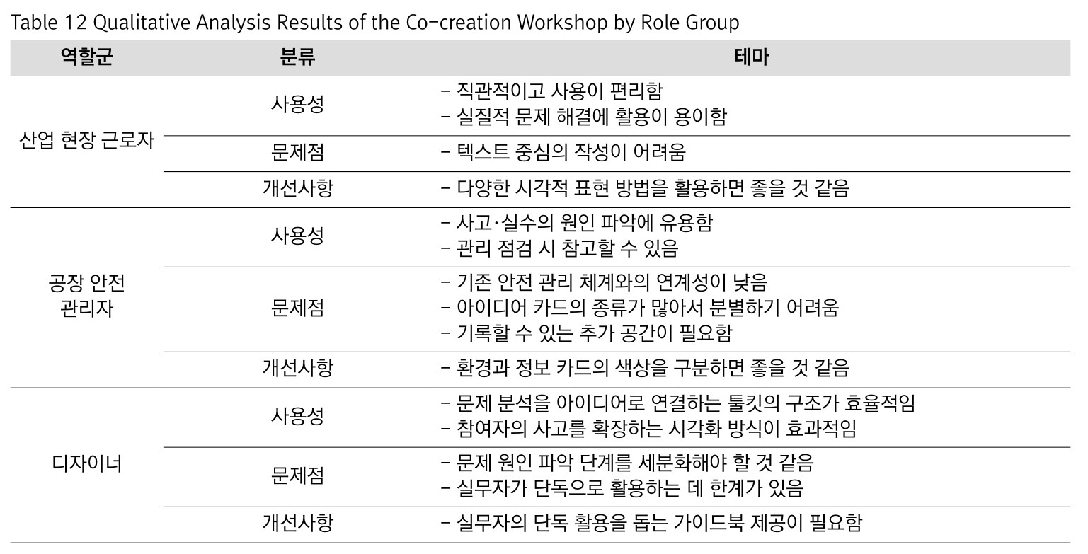 그러나 툴킷이 조직별로 상이한 안전 관리 시스템과 구조적 차이가 있어, 현장 도입 과정에 추가 조정이 필요하다는 점을 한계로 인식하였다. 마지막으로 디자이너는 문제를 분석하고 이를 아이디어로 연계하는 시각화 방식과 참여자의 사고를 확장하는 툴킷의 구성을 긍정적으로 평가하였다. 그러나 실무자가 단독으로 사용할 경우, 전체 프로세스를 이해할 수 있는 가이드북을 제공할 것을 요청하였다.
