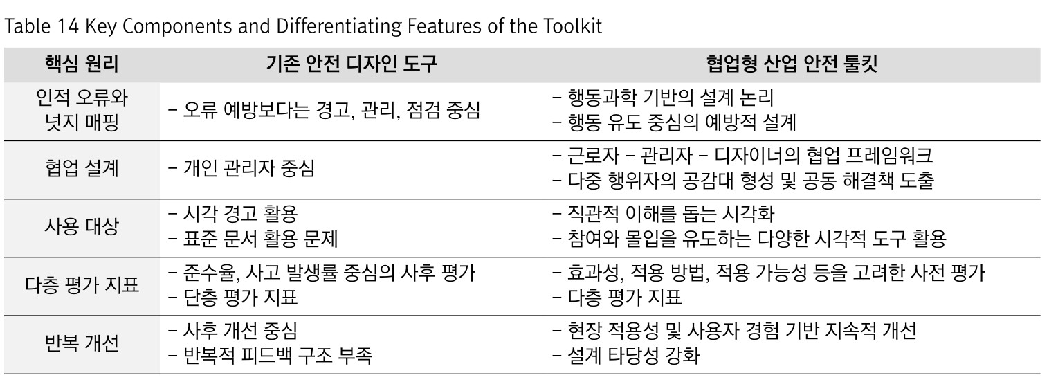 기존 안전 디자인은 안전보건 시각 경고, PPE(Promotion for Personal Equipment Use) 착용 점검, 위험 식별과 예방 조치를 점검하는 안전 체크리스트 등을 중점적으로 다루며 규범적·절차 중심 방식 의존해왔다(OECD, 2020; IOSH, 2012). 그러나 본 연구에서 제안하는 넛지 디자인을 활용한 협업형 산업 안전 툴킷은 기존의 관리자 중심의 일방적 전달체계와 이에 관한 규정 준수를 점검하는 방식에서 벗어나, 다양한 이해관계자가 협업하여 스스로 문제를 인식하고 해결책을 도출하는 예방적 설계를 지원한다. 본 연구에서 제안하는 산업 안전 툴킷과 기존 안전디자인과의 차별성을 다섯 가지 핵심 설계 원리를 중심으로 Table 14와 같이 정리하였다.