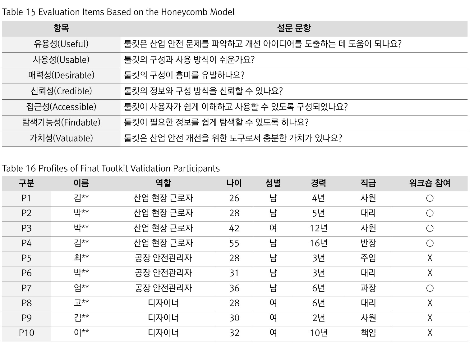 검증 과정은 툴킷에 대한 설명을 진행한 후, 참여자가 5점 척도로 응답하고 자유롭게 의견을 개진하는 방식으로 진행되었다. 허니콤 모델 평가항목의 구체적인 문항은 Table 15 와 같고, 검증 참여자의 프로파일은 Table 16과 같다.
