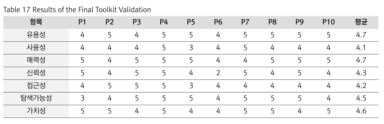툴킷 검증 결과 모든 항목은 4점 이상의 점수를 받았다. 가장 높은 점수를 받은 항목은 유용성(4.7)과 매력성(4.7)이었다. 이는 툴킷이 실제 문제 해결에 도움이 되고, 툴킷의 시각적 형태와 카드 구성이 흥미와 몰입을 유발한다고 인식되었기 때문으로 여겨진다. 또한 툴킷의 실제 적용의 효과와 가치를 평가하는 가치성(4.6)도 높은 점수를 받았는데, 이는 해당 툴킷이 산업 현장에서 효율적으로 활용될 수 있음을 시사한다.