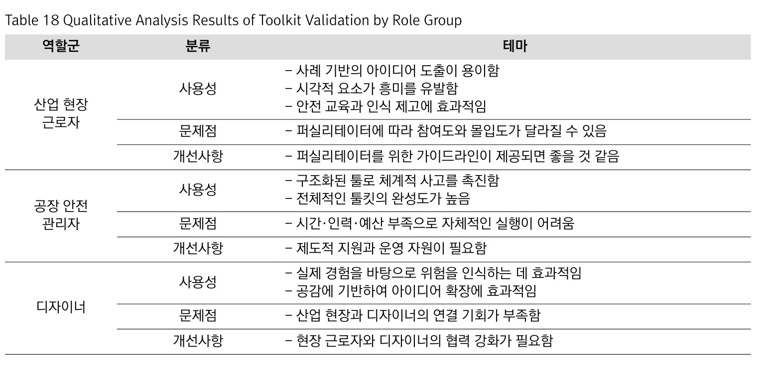 역할군별 참여자 의견에 대한 질적 분석 결과를 살펴보면, 산업 현장 근로자는 해당 툴킷이 안전 교육과 인식 제고에 효과적이라고 응답하였다. 특히 시각적 요소가 흥미와 몰입을 유도하고, 사례를 중심으로 한 툴킷의 구성이 실제 활용에 도움이 된다고 하였다. 그러나 워크숍 퍼실리테이터에 따라 참여와 몰입이 달라질 수 있기 때문에 퍼실리테이터를 위한 가이드라인이 제공되면 좋겠다는 의견을 주었다. 공장 안전관리자는 문제정의와 해결 과정이 구조화되어 체계적 사고를 촉진하고, 툴킷의 실용성과 적용 가능성이 높다는 점을 긍정적으로 평가하였다. 그러나 근로자를 대상으로 이러한 워크숍을 실행하기 위해서는 제도적 기반과 재정적 지원이 필요하다고 강조하였다. 디자이너는 사용자의 여정을 기반으로 위험 요소를 정의함으로써 문제를 명확히 인식하고 공감대를 형성하는 데 효과적이라고 응답하였다. 단, 아이디어의 구체화와 실행 가능성을 위해 산업 현장과 디자이너의 긴밀한 협력이 필요하다고 조언하였다. 검증에 참여한 참가자의 질적 분석 결과는 Table 18과 같다.