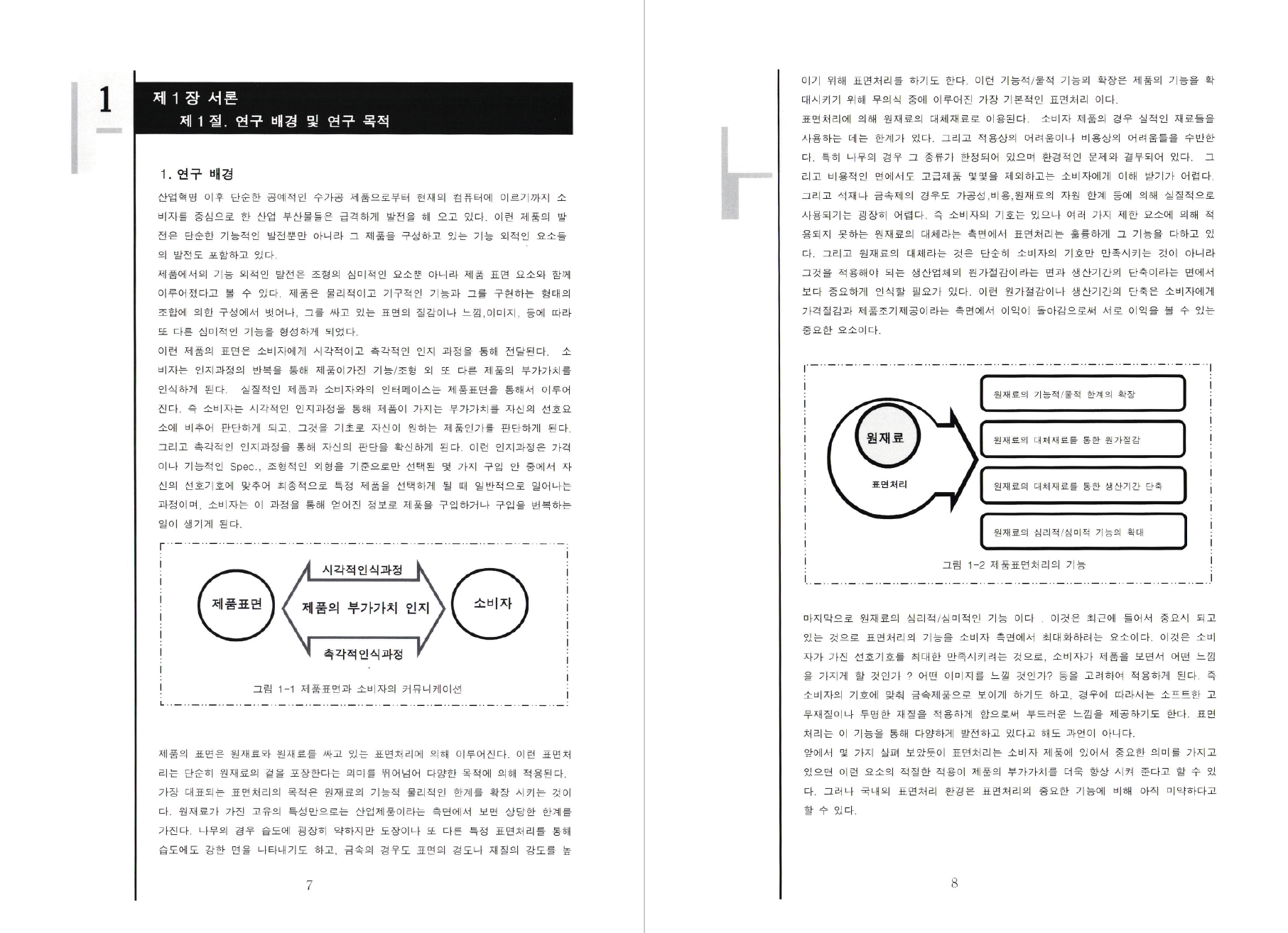 - 면조형은 소비자가 일반적으로 접하게 되는 생활 관련 제품들 이외에도 산업구분에서 보면 상당히 많은 영역에서 적용되고 있다. 이렇게 방대하게 적용되는 모든 부분에서의 표면조형을 모두 다룬 다는 것은 일시적인 작업으로는 불가할 정도이다. 그러므로 보다 효율적이고 합리적인 효과를 단기간에 얻기 위해서는 이런 다양한 산업영역 내에서 보다 소비자에 근접되어 있고 쉽게 접할 수 있는 전기전자 제품들과 플라스틱 소재 를 중심으로 대상으로 우선적으로 연구를 전개함 현재 다양한 소비자 관련 제품들을, 표면의 심미적인 기능이 우선인가 아니면 물리적기능이 우선되는가에 따른 축과 표면조형에 의해 효과가 크게 나타나는가의 표면조형 관여도의 축으로 Positioning 하였을 때, 표면조형의 효과가 크게 나타나는 전기제품과전자제품을 우선적으로 선정하여 그에 적용된 표면조형을 연구함.