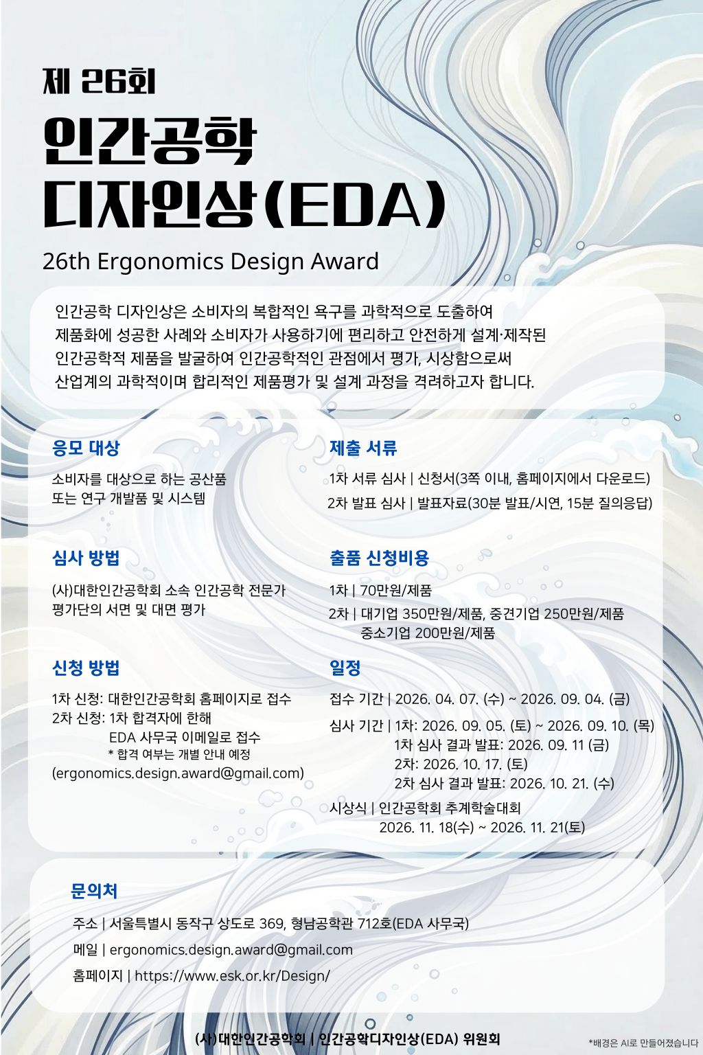 제26회 인간공학 디자인상 신청 및 제출 서류 양식에 대한 자세한 사항은 대한인간공학회 디자인상 홈페이지(www.esk.or.kr/Design)에서 확인할 수 있으며, 관련 문의는 EDA 사무국 이메일로 하면 된다.