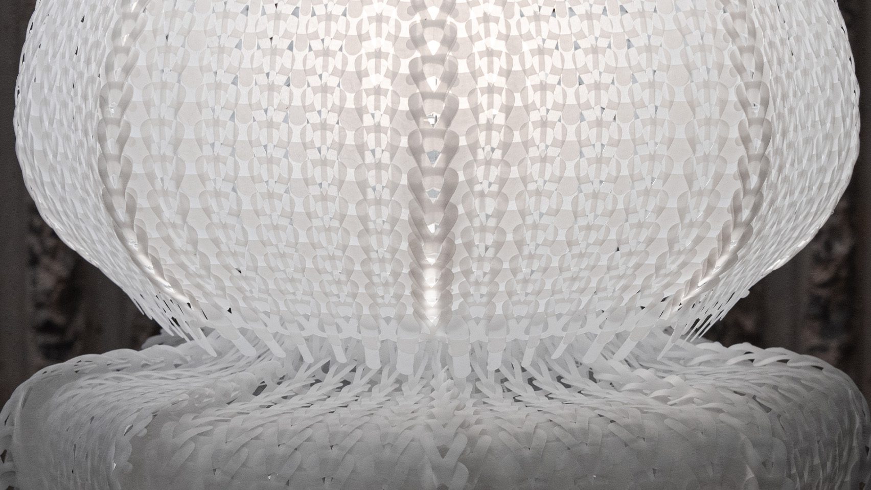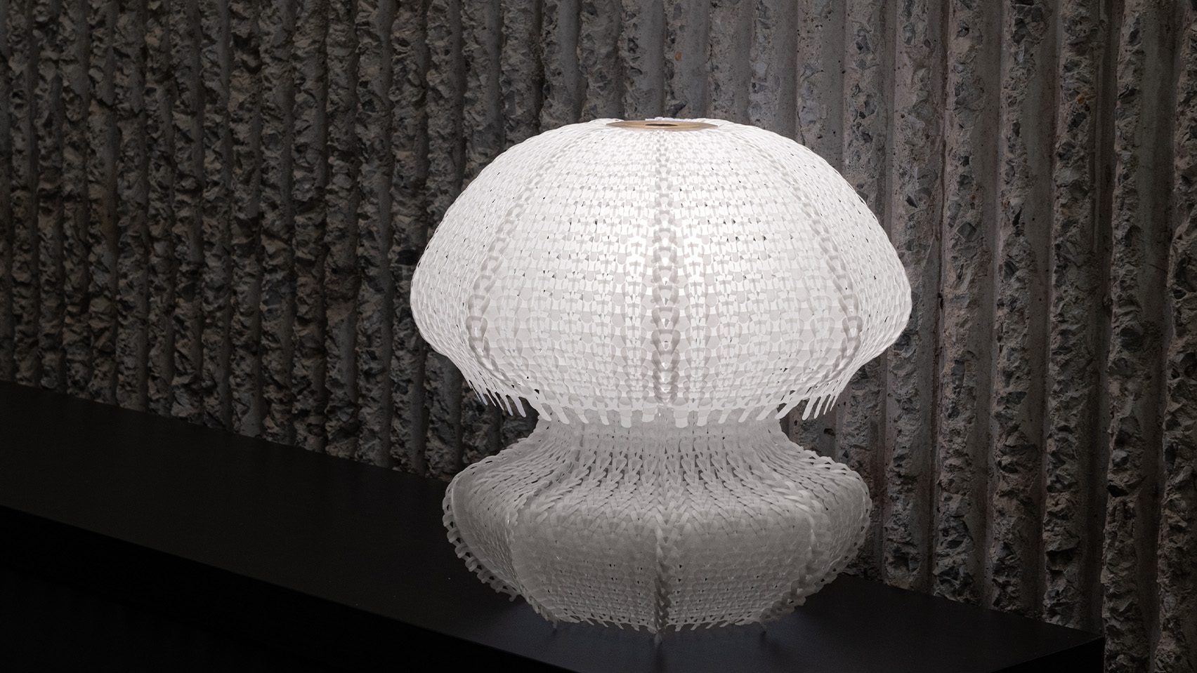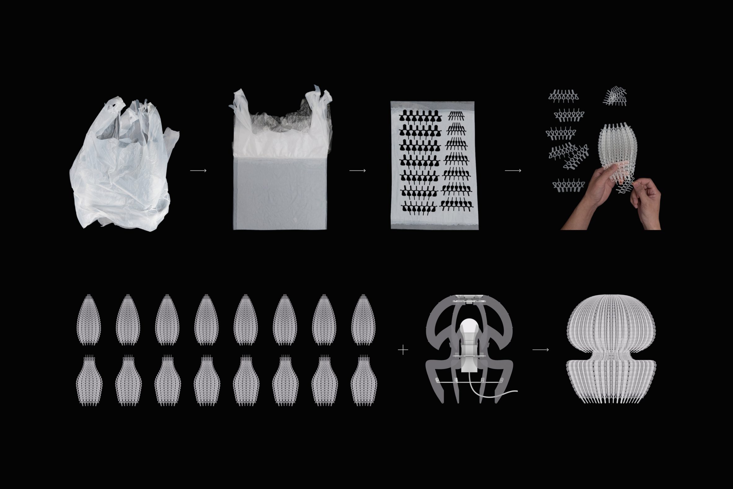 디자이너 쉐안하오 리(Xuanhao Li)는 디지털 제작 기법과 전통 수공예를 결합하여 버려진 폴리에틸렌 포장재를 해양에서 영감을 받은 조명으로 탈바꿈시켰다.