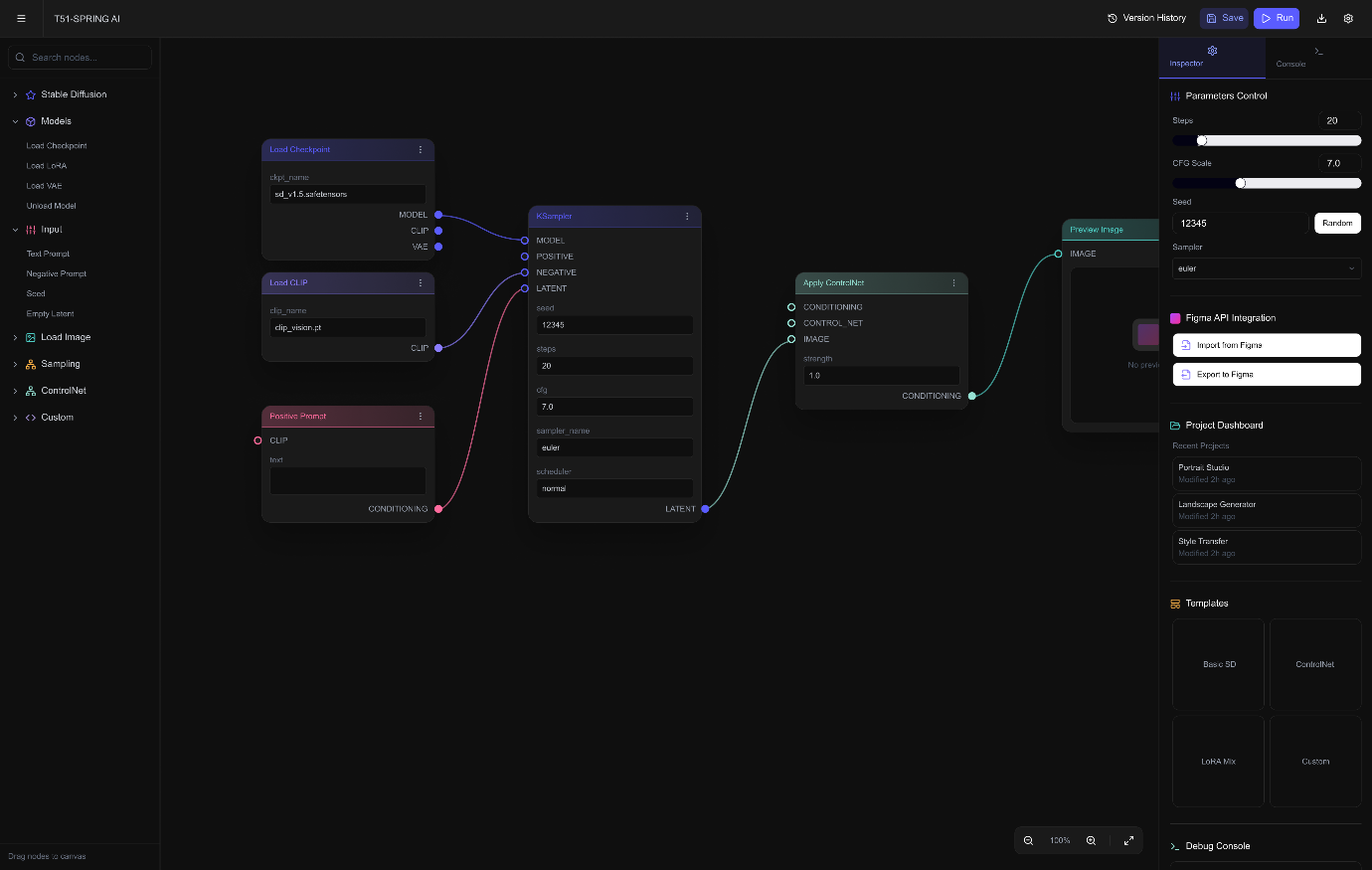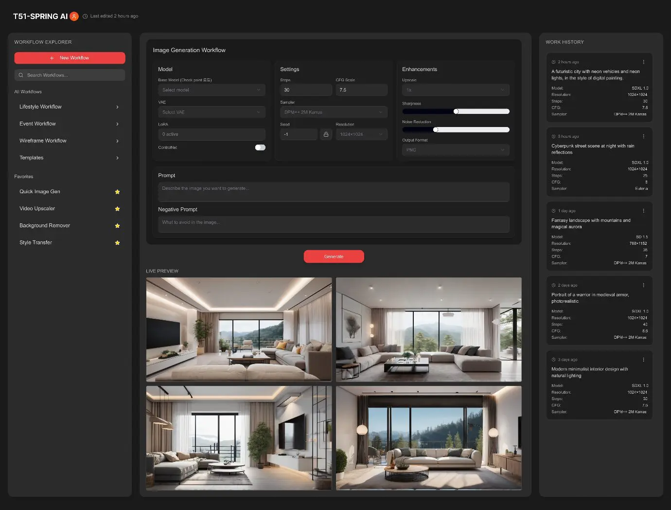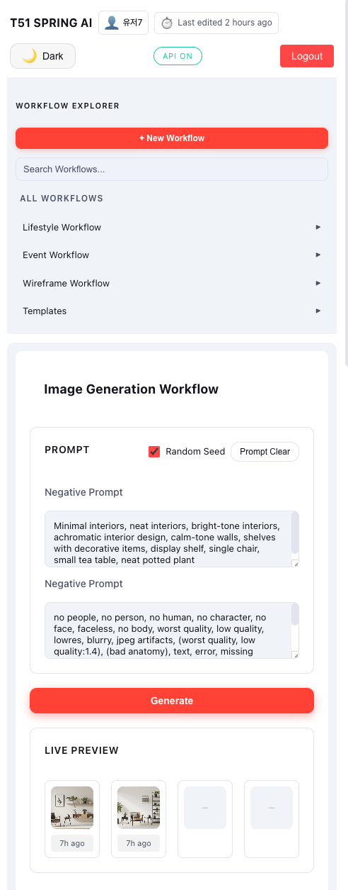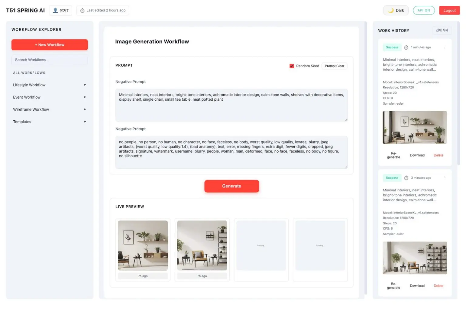 실제 T51-SPRING AI에선 AI 활용 능력이 뛰어난 숙련자들은 노드 모드에서 복잡하고 정교한 프롬프트 및 워크플로우를 설계해 에셋으로 저장하고, 일반 실무자들은 앞서 숙련자들이 미리 세팅해 둔 에셋을 선택해 불러와 사용할 수 있다. 이를 통해 일반 사용자도 필요한 몇 번의 클릭과 최소한의 키워드 입력만으로도 원하는 퀄리티의 결과물을 즉시 얻을 수 있다.