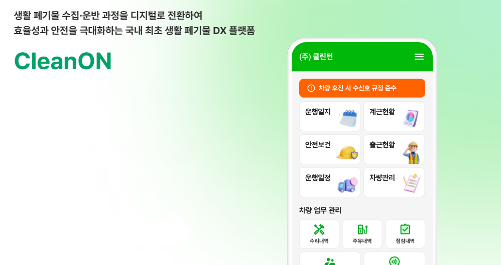 첫 번째 결과물이 클린온(CleanOn)이다. 운행일지와 작업 내용, TBM 등 기존에 수기로 관리되던 업무를 하나의 플랫폼에서 통합 관리할 수 있도록 한 시스템이다. 이를 통해 안전과 운영 성과를 데이터 기반으로 객관적으로 평가할 수 있게 됐으며, 행정기관의 종합 관리와 비교·분석이 가능해져 관리 체계의 고도화에도 기여하고 있다. 특히 비용 절감과 수집·운반 효율성 향상, 데이터 기반 경영을 통한 용역 입찰 경쟁력 확보는 물론, 중대재해처벌법 등 강화된 산업안전 규제에 대한 대응 기반도 마련했다.