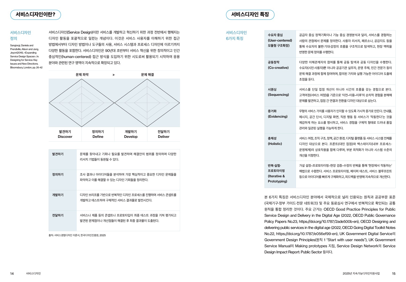 『2025 지속가능디자인지원사업 지원 결과 보고서』는 한국디자인진흥원이 추진한 2025년 지속가능디자인지원사업의 주요 성과를 담은 기록이다. 이 보고서는 국내 중소·중견기업이 디자인전문기업과 함께 서비스디자인 방법론을 활용해 제품, 서비스, 비즈니스모델(BM)을 개발하고 실증해 나간 과정을 정리한 자료이다.