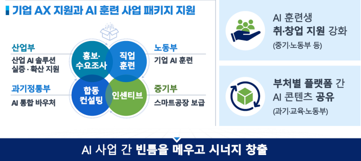대표적으로 기업 AX 지원 사업(과기정통부, 중기부, 산업부)과 기업 AI 훈련 사업(노동부)을 패키지로 제공한다.