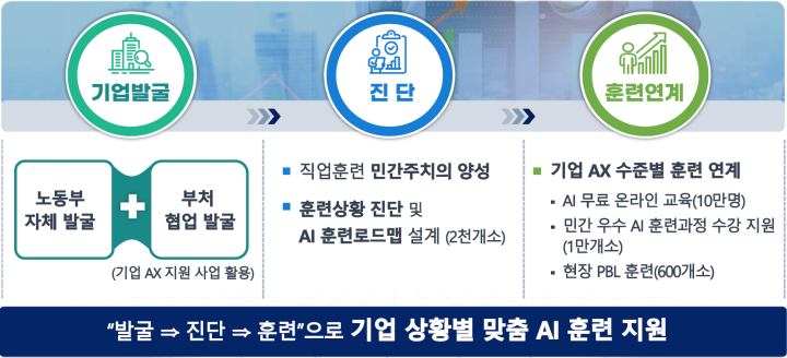 이에 따라 노동부는 AI 훈련 희망 중소기업 발굴과 훈련수요 진단, 맞춤훈련을 패키지로 지원할 계획이다.