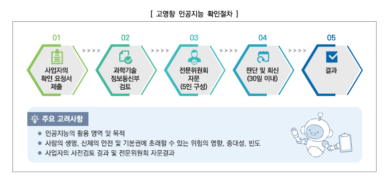 사업자는 자사의 AI가 고영향 인공지능에 해당하는가에 대한 확인을 요청할 수 있다. 사업자가 고영향 인공지능에 대한 확인 요청서를 제출하면, 과기정통부 검토→전문위원회 자문→판단 및 회신의 절차를 거친다. 해당 절차에서 주요하게 고려하는 사항은 다음과 같다.
