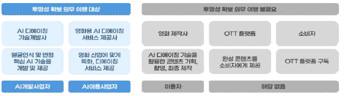 「인공지능 투명성 확보 가이드라인」은 이용자에게 최종적으로 AI 제품 및 서비스를 제공하는 인공지능사업자에게 부과되는 의무인 ‘인공지능 투명성 확보 의무’를 다룬다. 단순히 AI 제품이나 서비스를 이용한 결과물을 자신의 서비스에 활용한다면 적용 대상이 아니다.