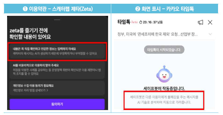 - 서비스 이용약관, 서비스 가입 절차 및 계약서에 생성형 AI 또는 고영향 인공지능 표시