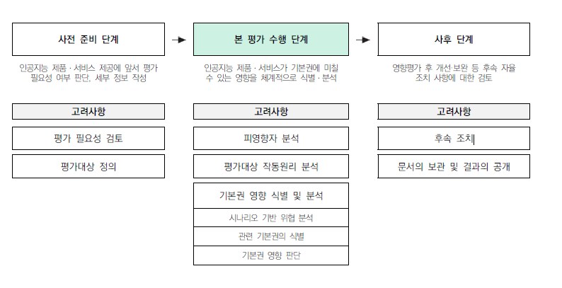 인공지능 영향평가는 ‘사전 준비→본 평가 수행→사후’ 단계로 진행된다. 사전 준비 단계에서는 평가 필요성을 검토하며, 제품·서비스가 고영향 인공지능에 해당하는가를 평가한다.