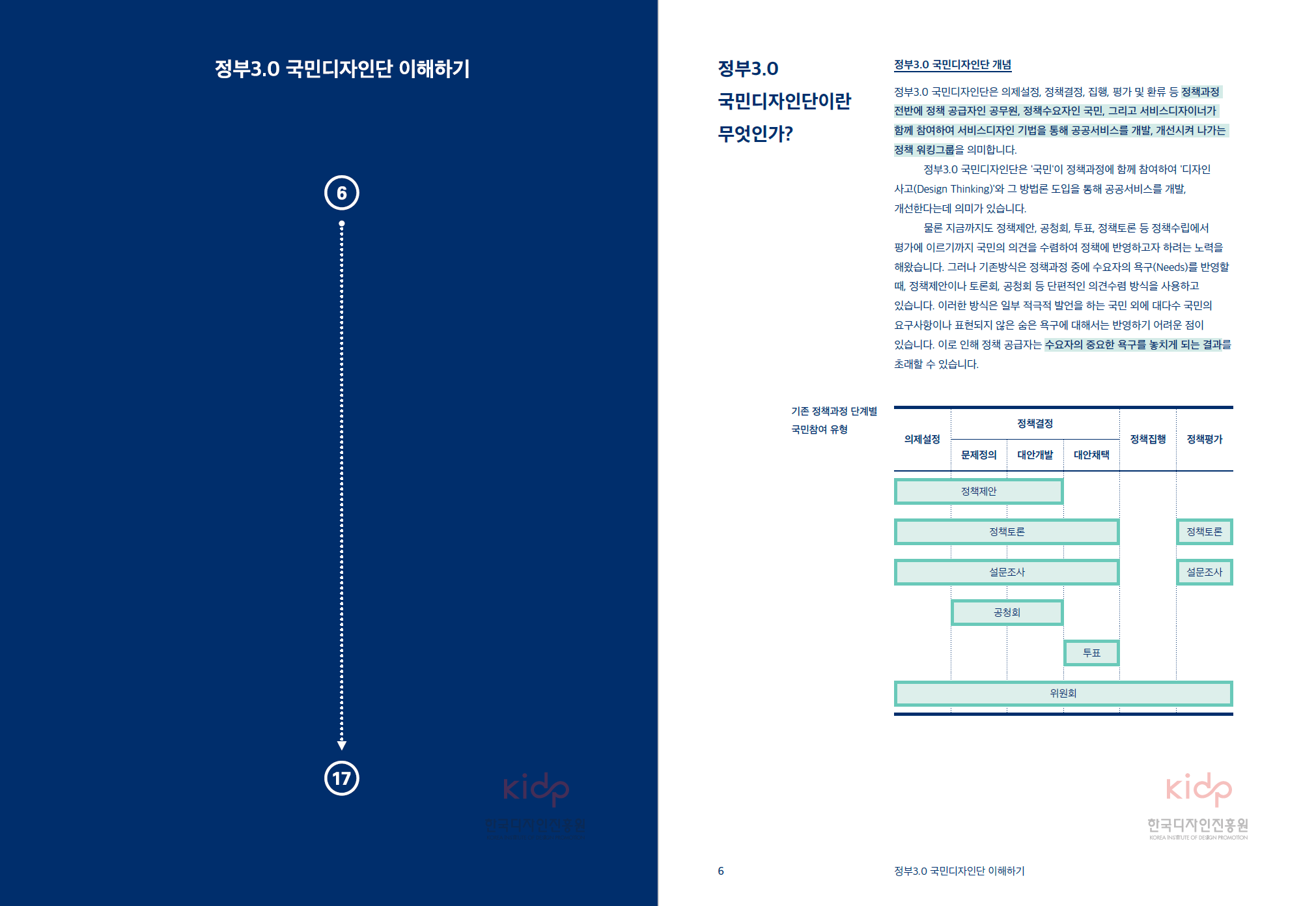 이 책은 국민디자인단을 기획하고 운영하는 공무원들을 위한 매뉴얼입니다. 서비스디자인 프로세스에 따라 국민이 원하는 정책을 만들어 보세요.