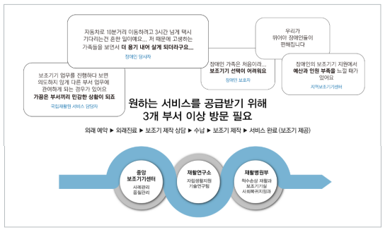 (문제점) 장애인이 보조기기를 혼자서 선택하여 구매하기 곤란하고, 보조기기 지원정책이 너무 복잡하며, 여러 기관을 방문해야 함.