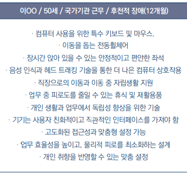 중점을 두어 일과 생활을 지원하기 위해 기술적, 물리적, 심리적 요소들을 모두 고려하여 페르소나 설정