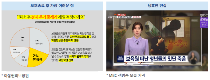 ㅇ 아동복지시설 등에서 보호 중인 아동은 만 18세(연장시 24세)가 되면 보호가 종료되며, 이른 시기에 홀로 삶을