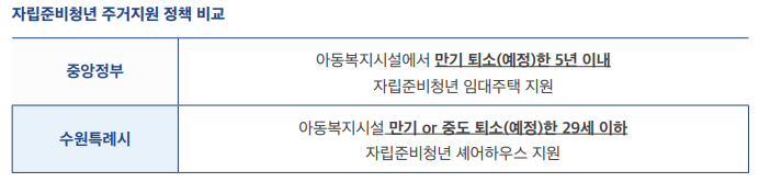 ㅇ 아동복지시설에서 만기 퇴소(예정)한 자립준비청년에게는 임대주택 지원 등 주거 및 지원정책이 마련되어 있지만,
