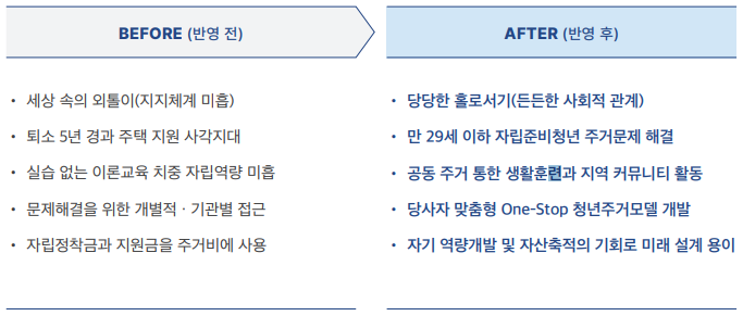 ㅇ 자립준비청년들이 세상 속 외톨이가 아닌 당당한 홀로서기를 할 수 있도록 주거지원을 기반으로 지역사회 커뮤니티