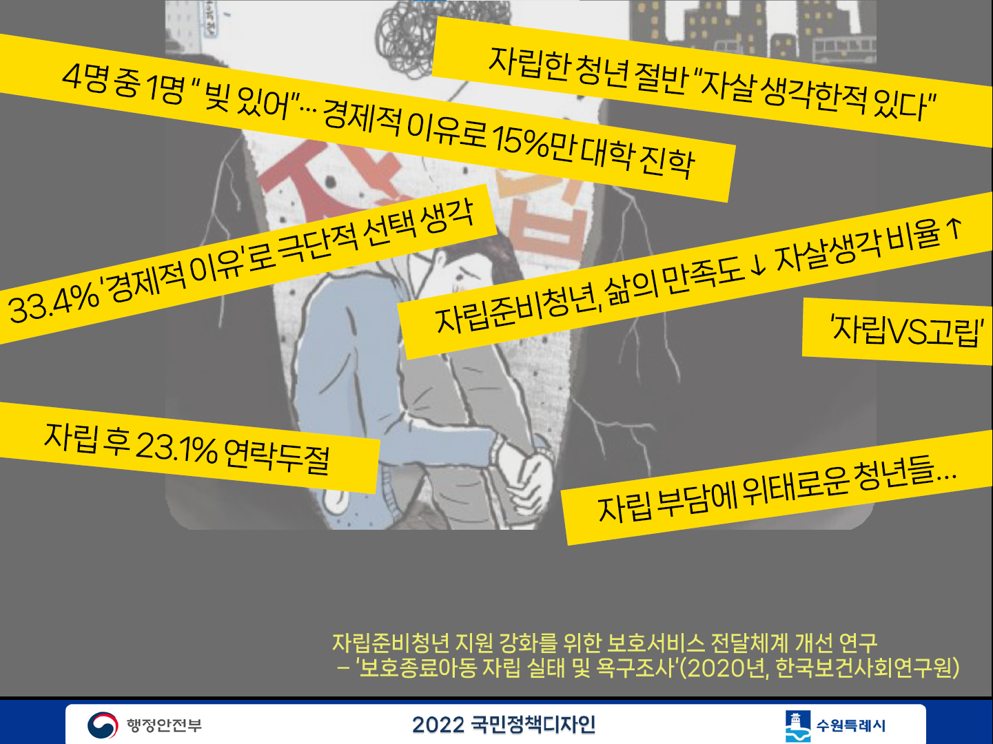 심리·정서적, 사회·경제적 지지체계가 매우 낮아 극단적인 선택에 내몰리고 있습니다. 자립준비청년들이