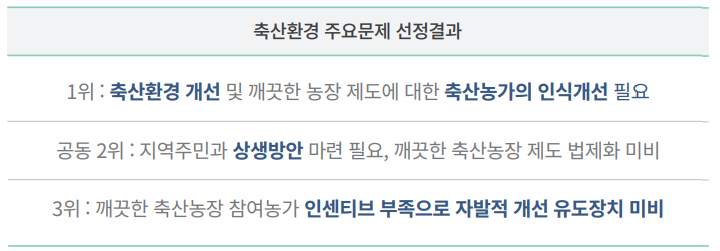그 결과 현재 축산환경의 대한 주요 문제점을 아래와 같이 선정하였습니다.
