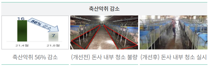 내부 평균 악취농도가 56% 감소한 7ppm으로 측정되는 등 축산농가의 악취개선