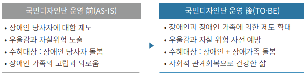 ㅇ 기존에 실시되고 있는 장애인 대상 상담바우처를 이번 국민디자인단 회의를 통해 장애인 가족을 위한 상담바우처의 필요성에 대한 아이디어를 도출하였다.