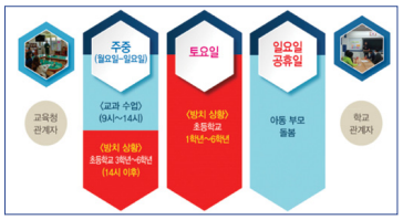 ㅇ 초등 돌봄 정책 관계자들과의 맥락적 조사 결과 농촌 지역의 아동돌봄 정책의 주중 오후 및 토요일 종일 시간대의 아동돌봄 사각지대를 발견하였다.