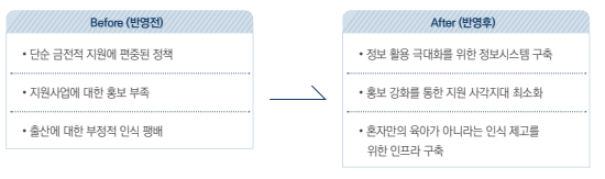 → 지금까지 추진해온 단순 금전적 지원에 편중되어 있는 출산지원사업에서 벗어나 새로운 출산장려정책 발굴이