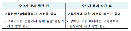 - 나와 상관 없는, 형식적 교육이라는 거부감을 해소하기 위해 뚜렷한 ‘장애인 고용‘이라는 교육 목적성 강조