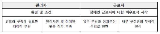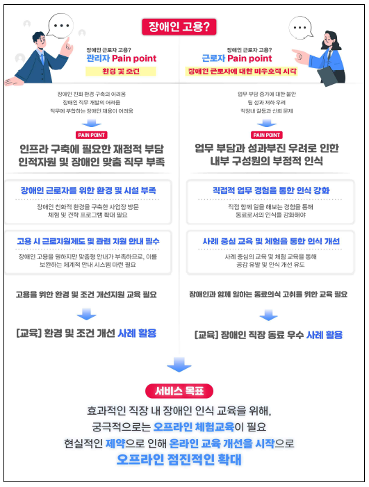 - (관리자 핵심문제) 인프라 구축에 필요한 재정적 부담 인적 자원 및 장애인 맞춤 직무 부족