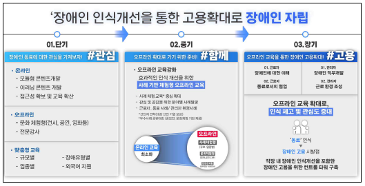 - 장애인에 대한 관심을 유도하고, 실질적인 인식 개선 교육으로 장애인일자리 확대와 경제적 자립 목표를 바탕으로 교육 로드맵 구축