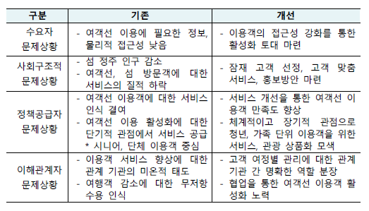 ○ 정책수요자 관점 서비스 개선을 통한 여객선 이용, 도서 방문객 활성화 방안 마련 필요