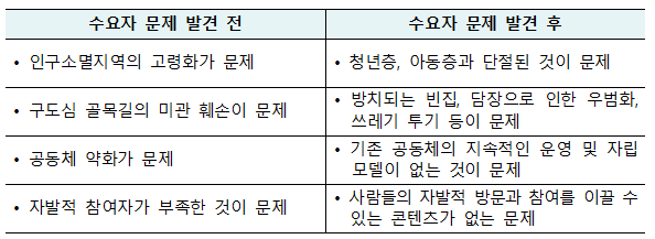 - (자립방안 부재) 기존 공동체, 거점시설의 지속가능한 운영 수단 부족