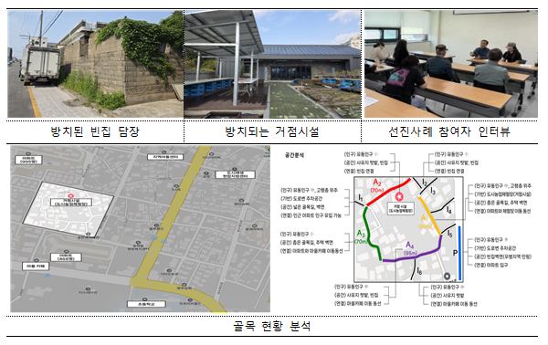 - 지역 주민이 함께하는 ‘다모이길’ 조성: (정원모델)거점시설, 골목 공간분석을 통한 정원 조성 계획 도출, (시범조성)빈집, 담장 활용 식물 식재를 통한 포토존 조성, (참여유도)기존 지역 공동체 연계를 통한 활동 홍보